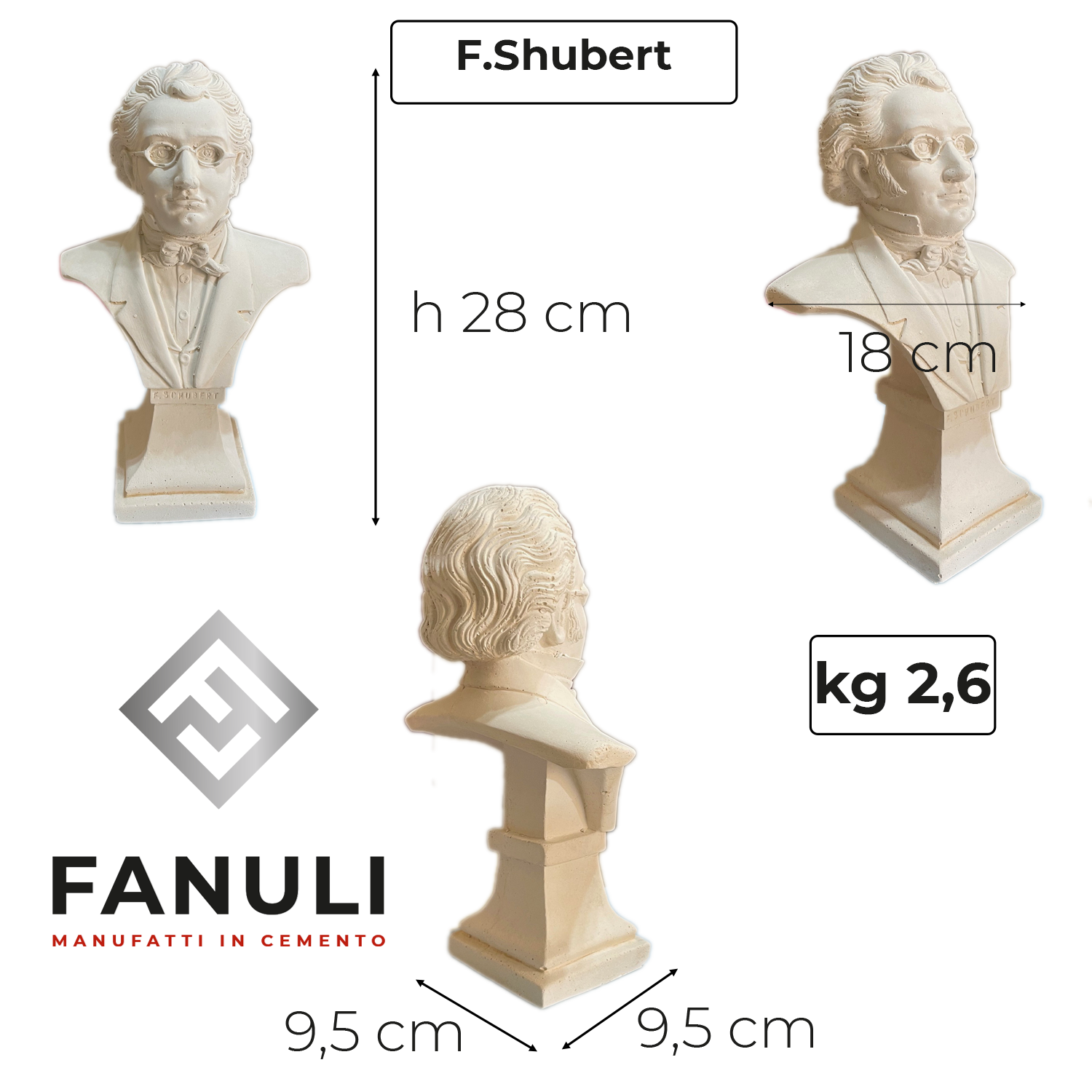 Aggiungi un tocco di eleganza musicale al tuo spazio con il busto di Franz Schubert, realizzato in cemento bianco di alta qualità. Con un’altezza di 30 cm, questa statua è ideale per arricchire sia interni che esterni, grazie alla sua resistenza agli agenti atmosferici.