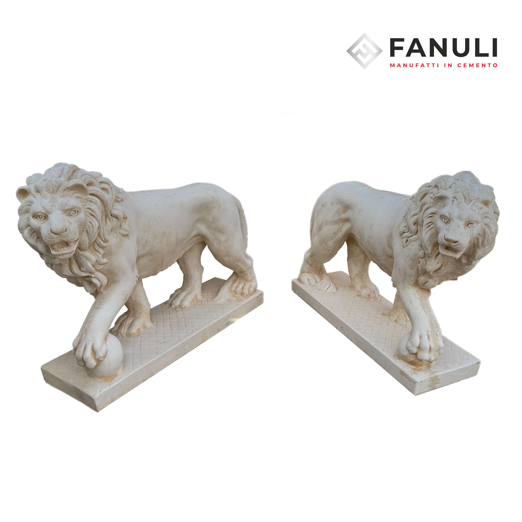 Manufatti artistici Fanuli per ingressi prestigiosi e giardini eleganti. Elegante coppia di leoni ornamentali realizzati in cemento ad alta resistenza, ispirati allo stile classico palladiano. Le statue, raffigurate in posizione fiera con zampa su sfera, sono progettate per resistere a qualsiasi condizione atmosferica, rendendole perfette per decorare colonne di cancelli, viali o ingressi principali. La lavorazione artigianale garantisce dettagli nitidi e una solidità strutturale superiore.