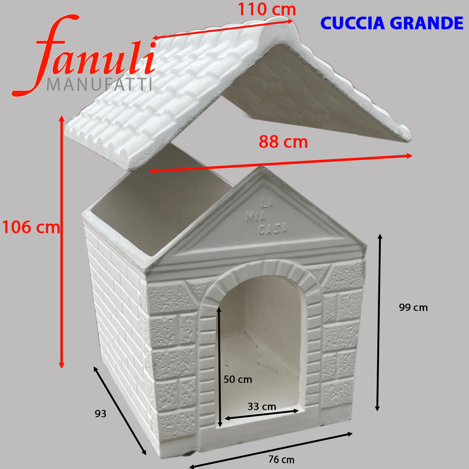 - CARATTERISTICHE: Come si vede dalle foto, la cuccia è formata da soltanto 2 pezzi; Il tetto e la cuccia è un blocco unico, Cuccia Grande e Media hanno incorporati 4 piedini nascosti di 6 cm per far defluire le acque ove stessero poggiate su un pavimento in cortile