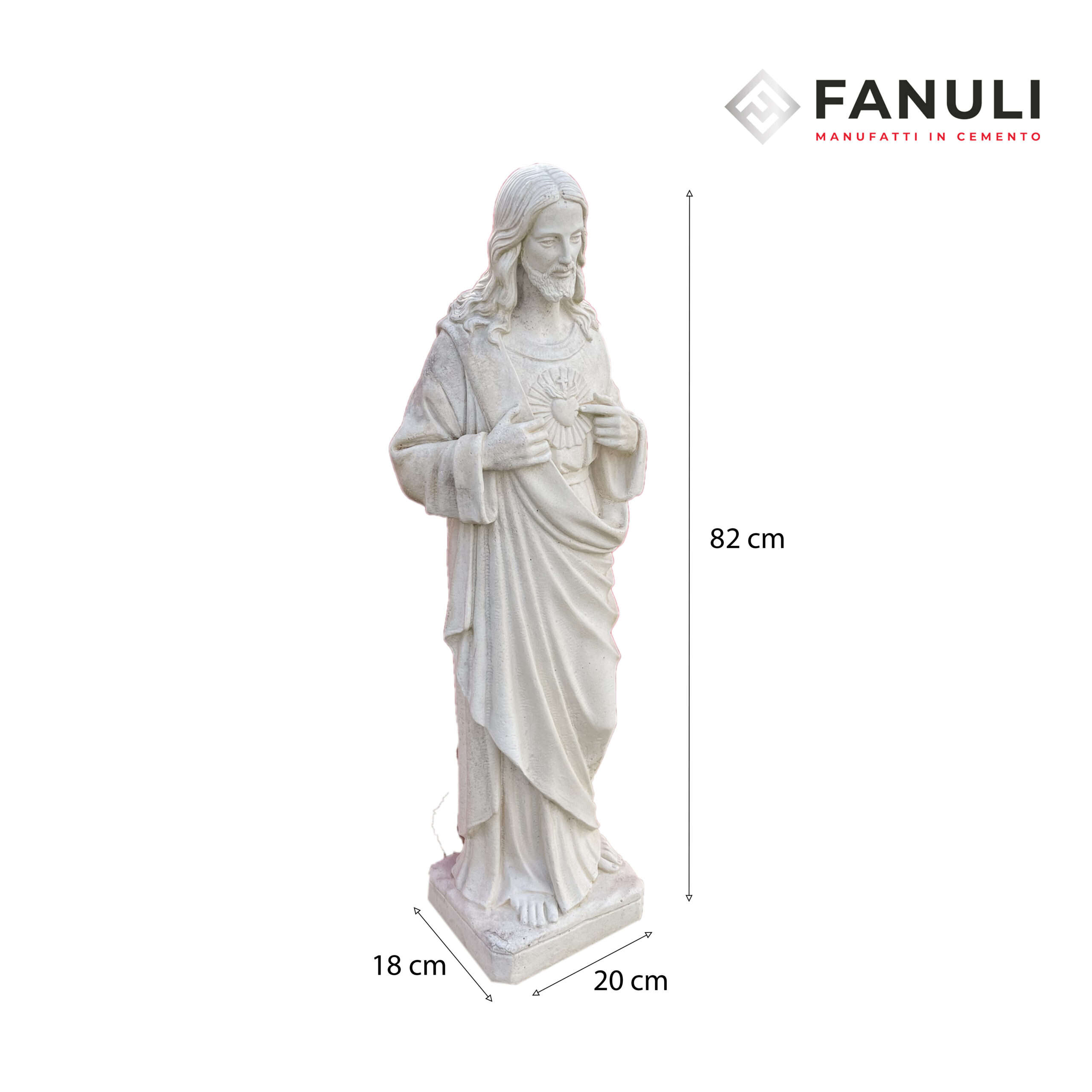 Arricchisci la tua casa, giardino, ufficio, cimitero o nicchia con questa splendida statua in cemento bianco del Sacro Cuore di Gesù. Con un’altezza di 82 cm e una base di 20 cm x 18 cm, questa statua è realizzata per arredare i vostri ambienti sia esterni che interni.