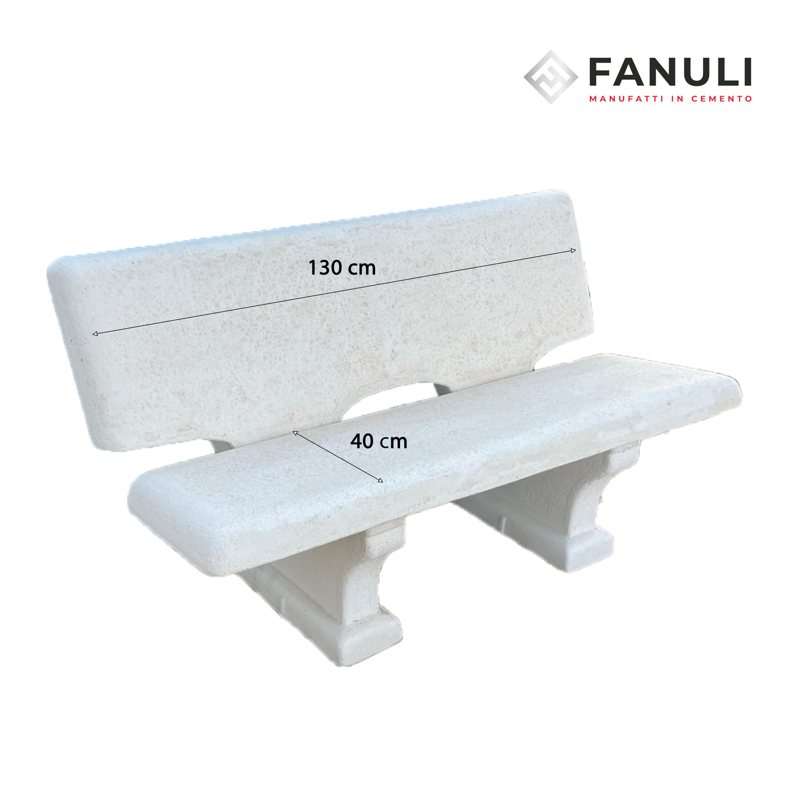 PANCA CON SCHIENALE BOCCIARDATA DA 130 cm IN CEMENTO BIANCO E POLVERE DI MARMO, resistente a tutte le intemperie.