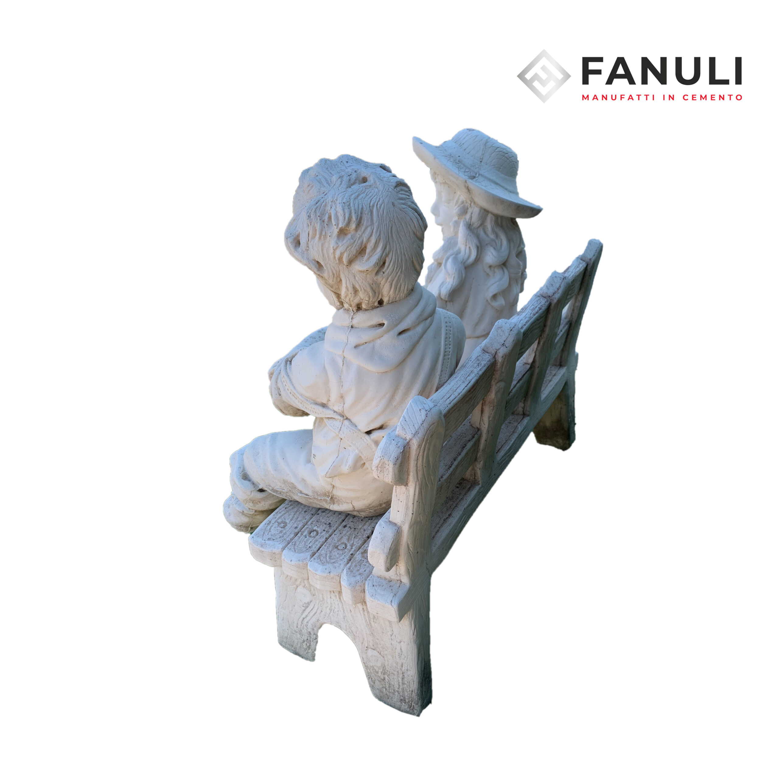 Porta un tocco di allegria nel tuo ambiente con la nostra panchina in cemento bianco, impreziosita da due dolci bambini seduti, Matteo e Chiara.