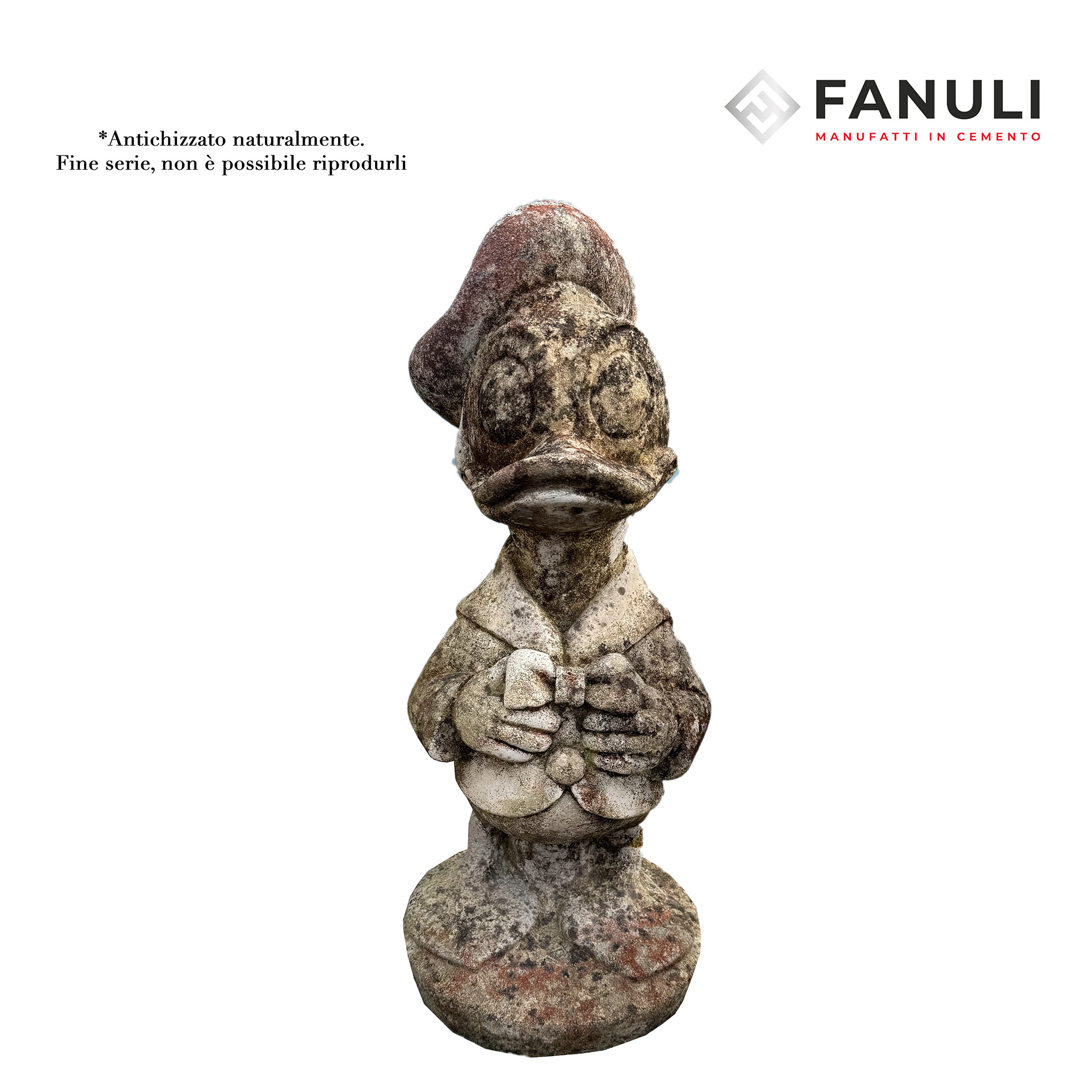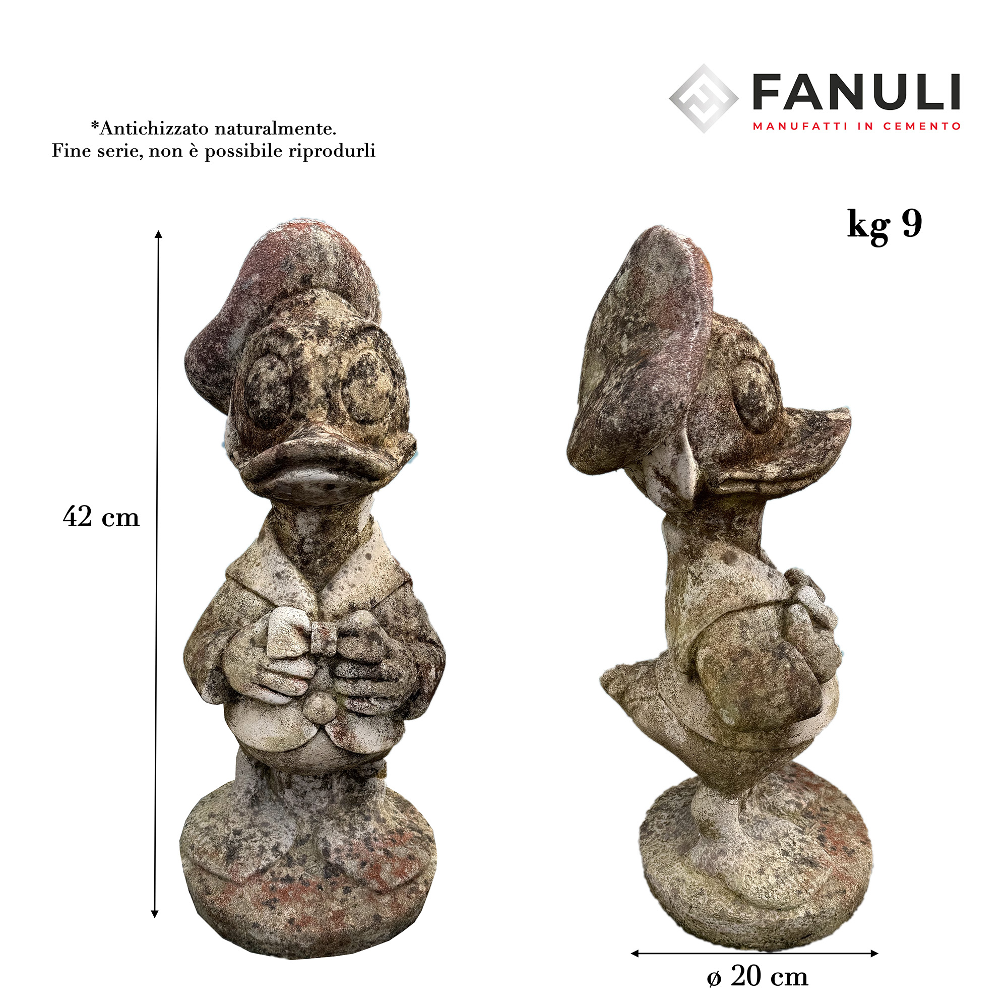 Paperino altezza 42 cm, PEZZI ANTICHIZZATI NATURALMENTE e non riproducibili in quanto fuori serie, si consiglia al momento dell’ordine di inviare un messaggio whatsapp per richiedere disponibilità e video del prodotto.