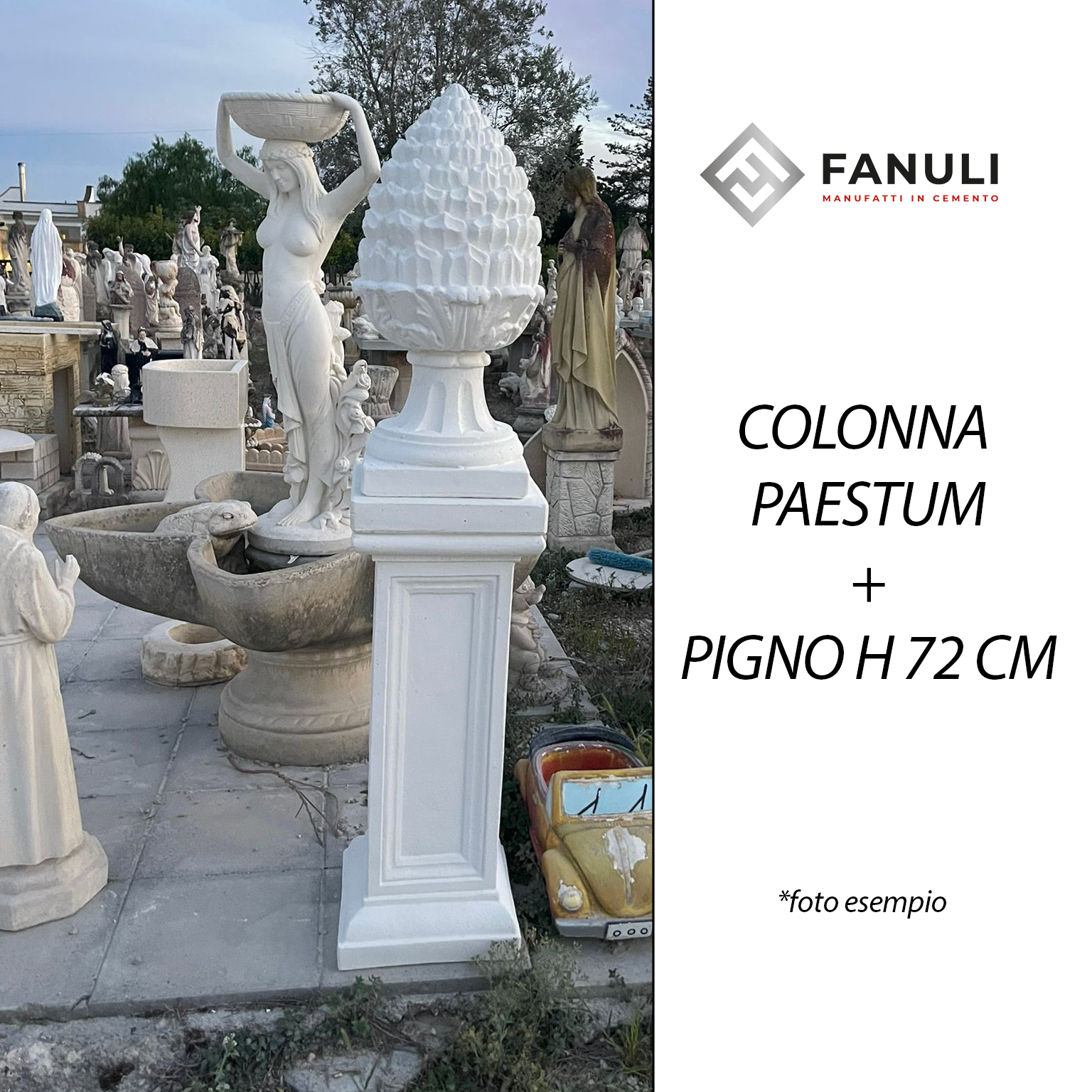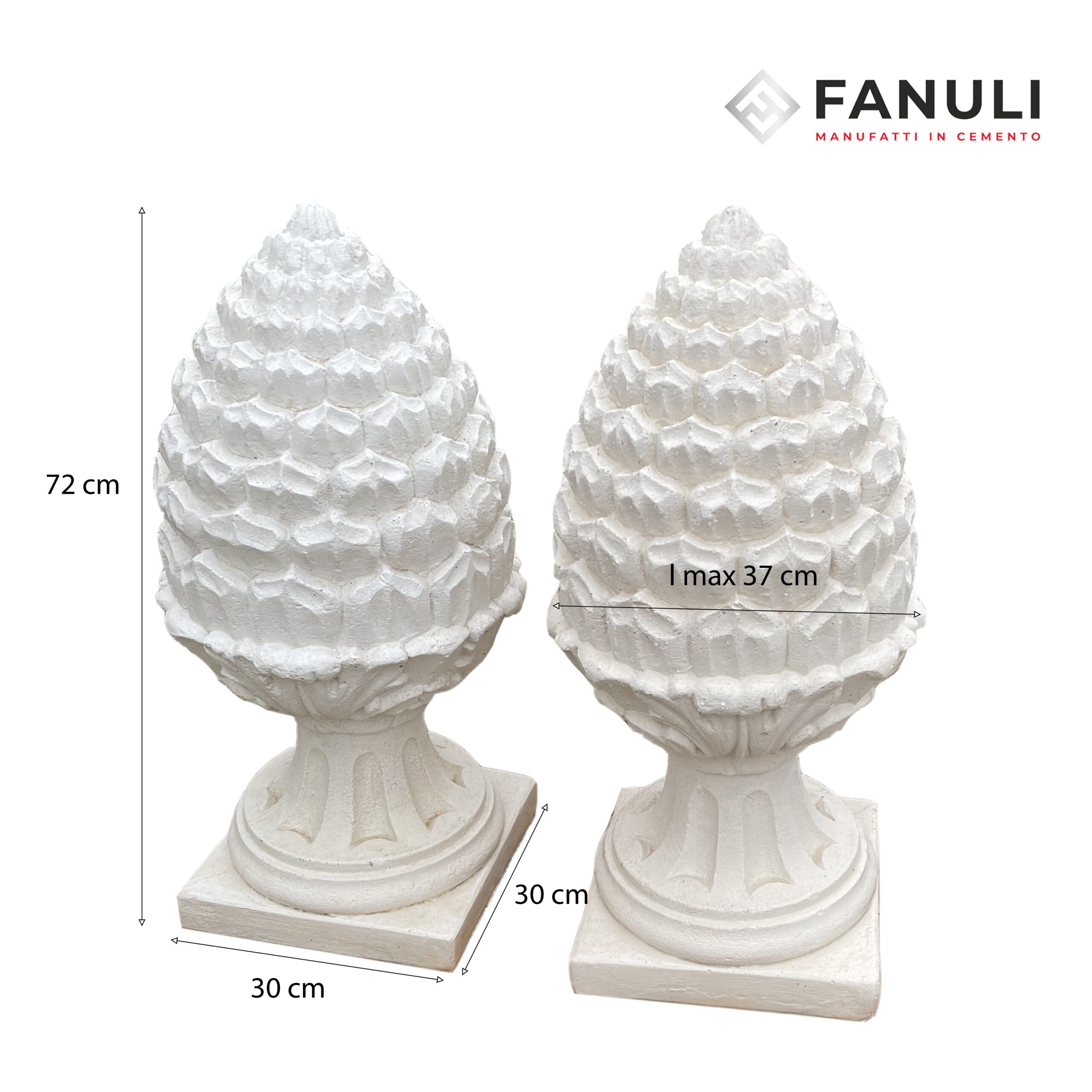 Pigno in cemento bianco, alto 72 cm, Base appoggio 30 x 30 se appoggiato su capuccio di colonna si consiglia per una questione estetica di appoggiarlo su cappucci di almeno 35 x 35 cm; la colonna dev’essere sempre più larga