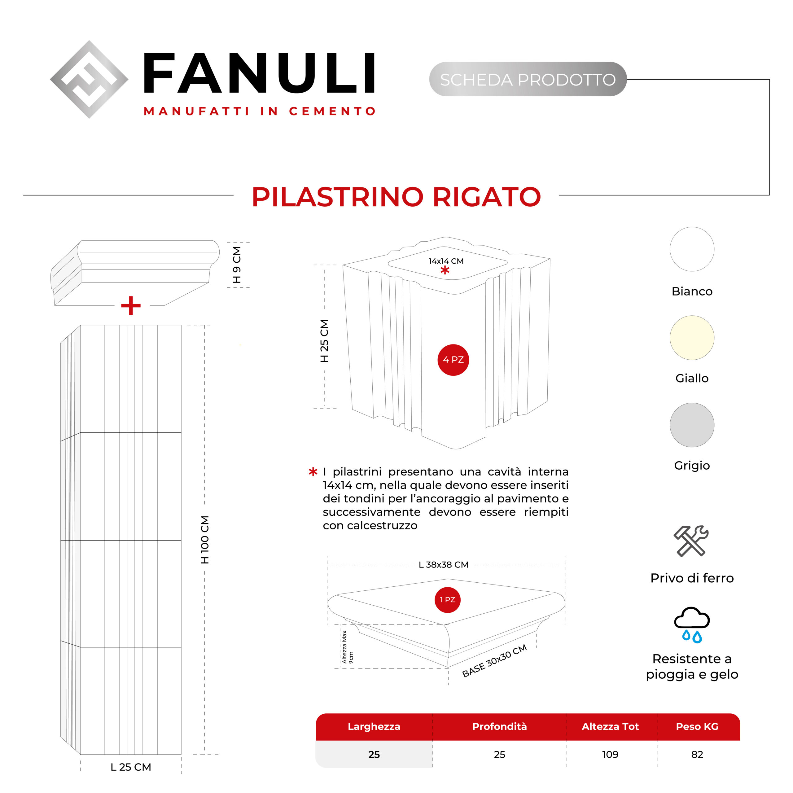 CARATTERISTICHE TECNICHE: Il Pilastrino di standard viene venduto altezza 100 cm più il capuccio. E’ largo 25 x 25 cm e l’altezza di ogni singolo blocchetto dipende dal modello scelto se colonna rigata h 25 cm; sè pilastrino semplice h 10 cm
