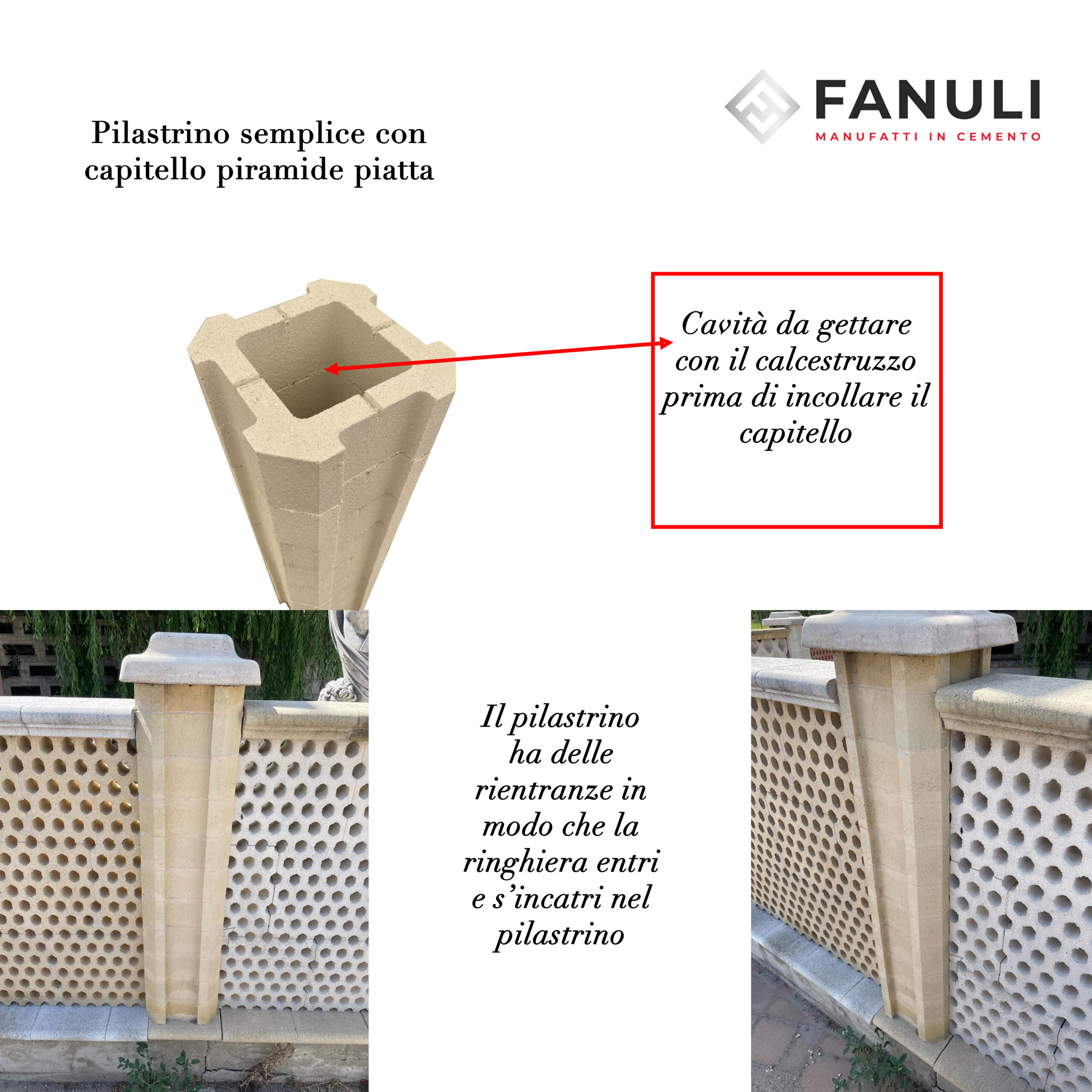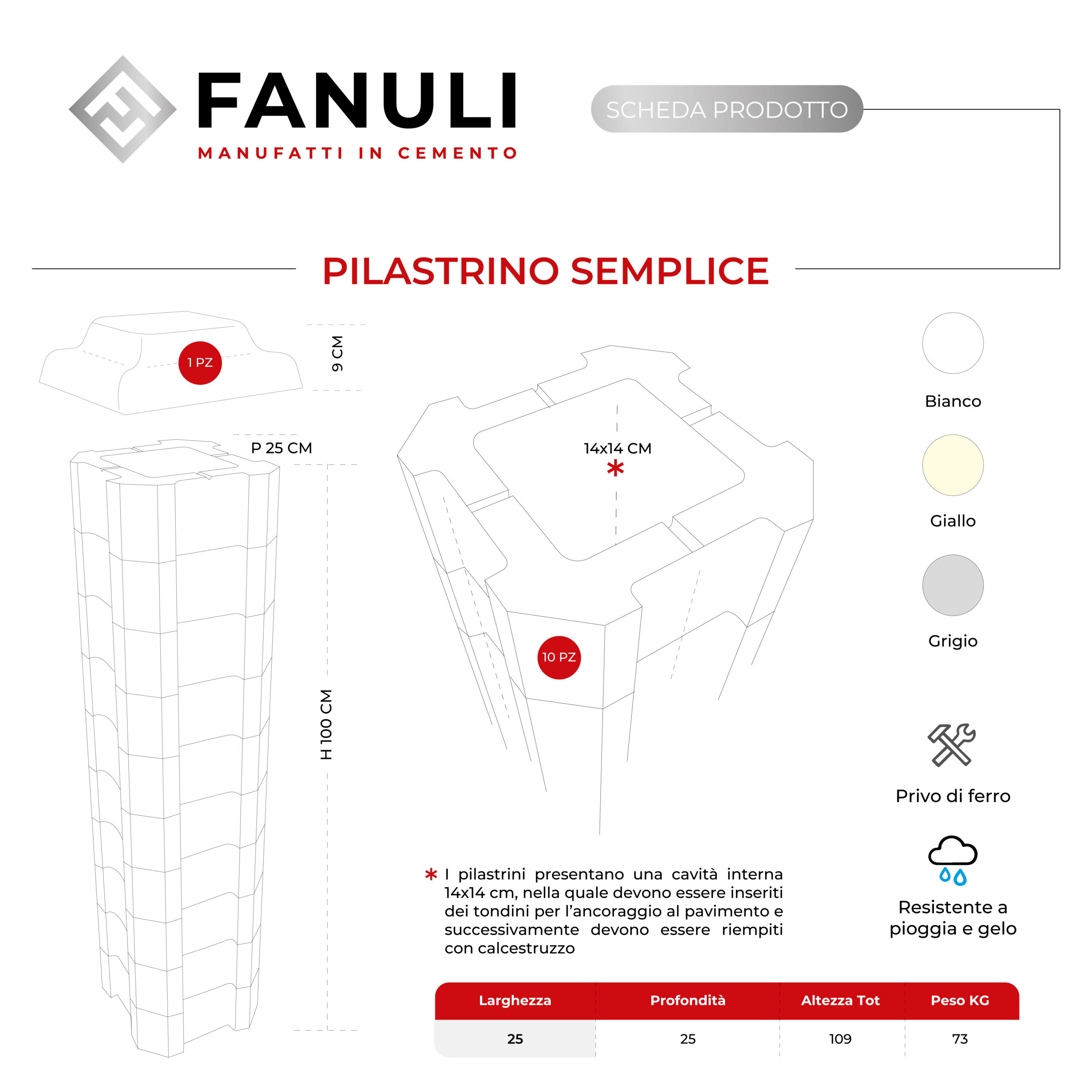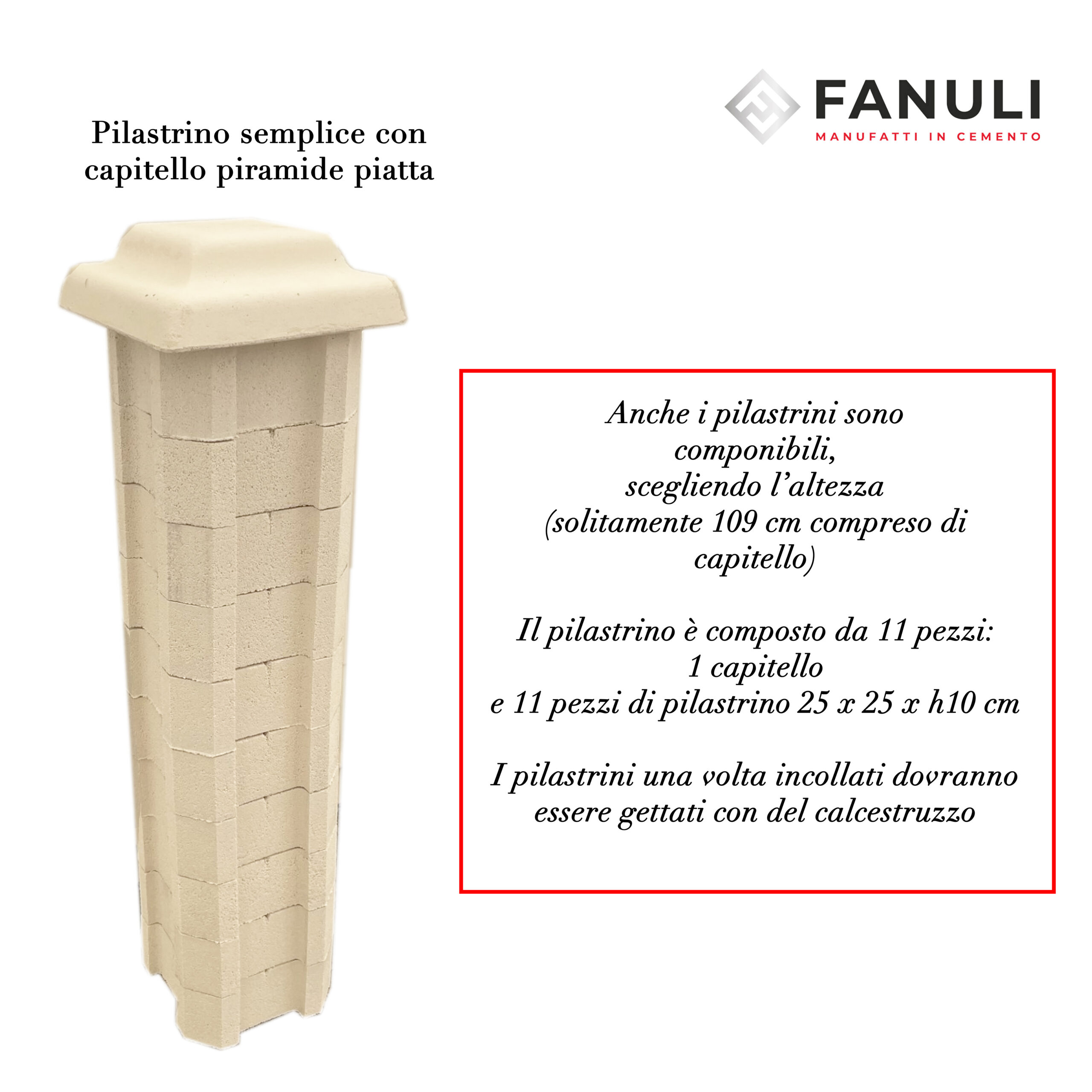 CARATTERISTICHE TECNICHE: Il Pilastrino “semplice” di standard viene venduto altezza 100 cm più il capuccio. E’ largo 25 x 25 cm e l’altezza di ogni singolo blocchetto del pilastrino semplice è h 10 cm