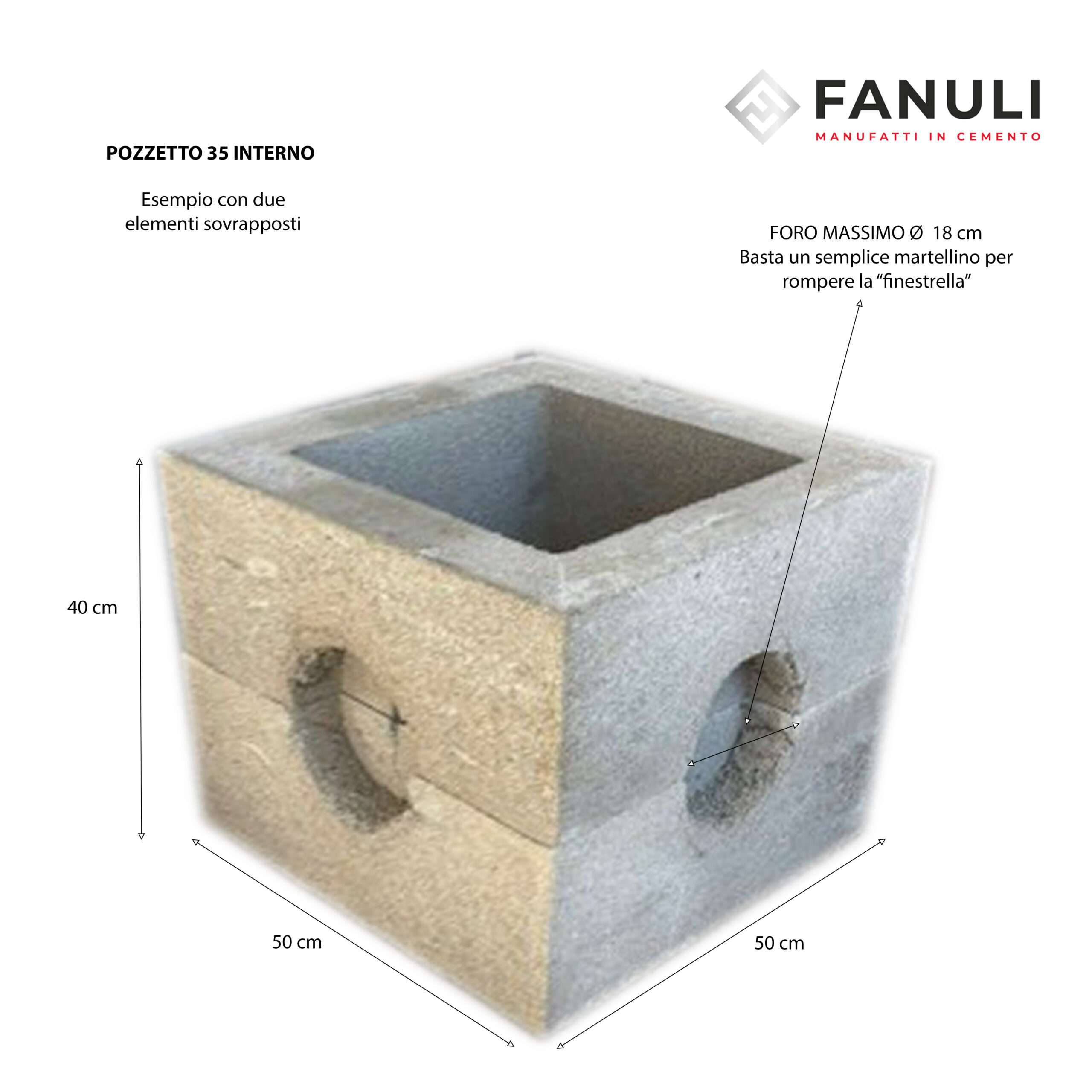 Pozzetto Idrico o Elettrico 35 in cemento interno senza fondo, componibile in altezza, il pozzetto ha già le cavità predisposte per essere aperte con facilità .
