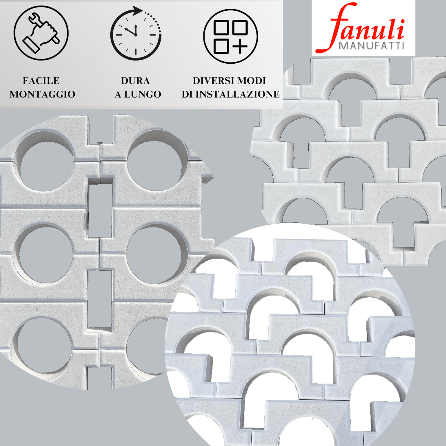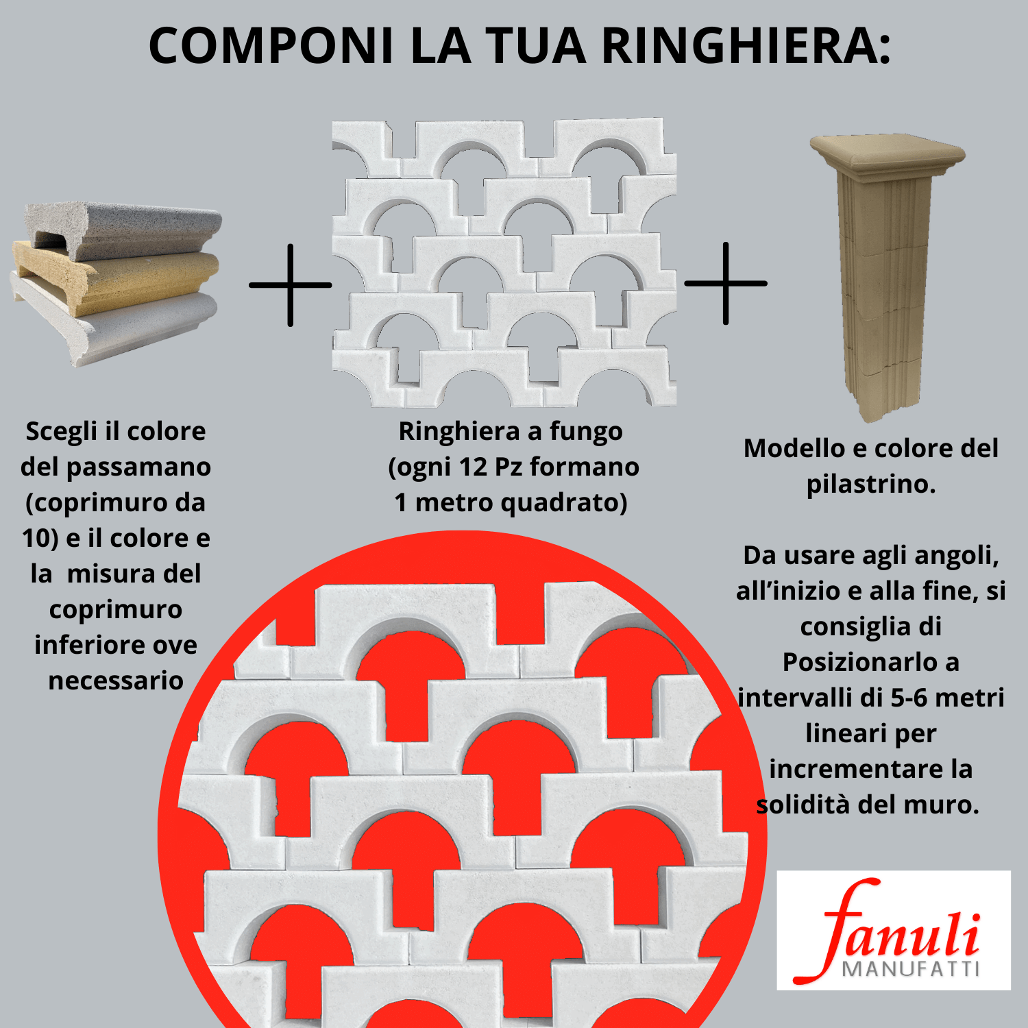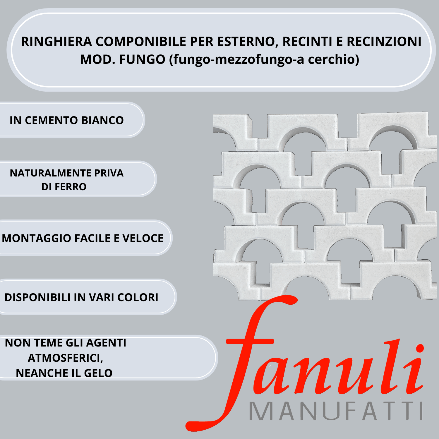 Personalizzabile e facile da montare, la Ringhiera a Fungo di fanuli manufatti è in cemento bianco, è perfetta da utilizzare anche come recinzioni per giardino o balaustra per esterni. Il prezzo si riferisce ad un metro quadrato (12 pezzi), escluso di passamano e/o coprimuro; Priva di armature in ferro, garantisce una maggiore stabilità in qualsiasi ambiente, evitando qualsiasi fenomeno di corrosione dovuto all’umidità con il trascorrere del tempo.