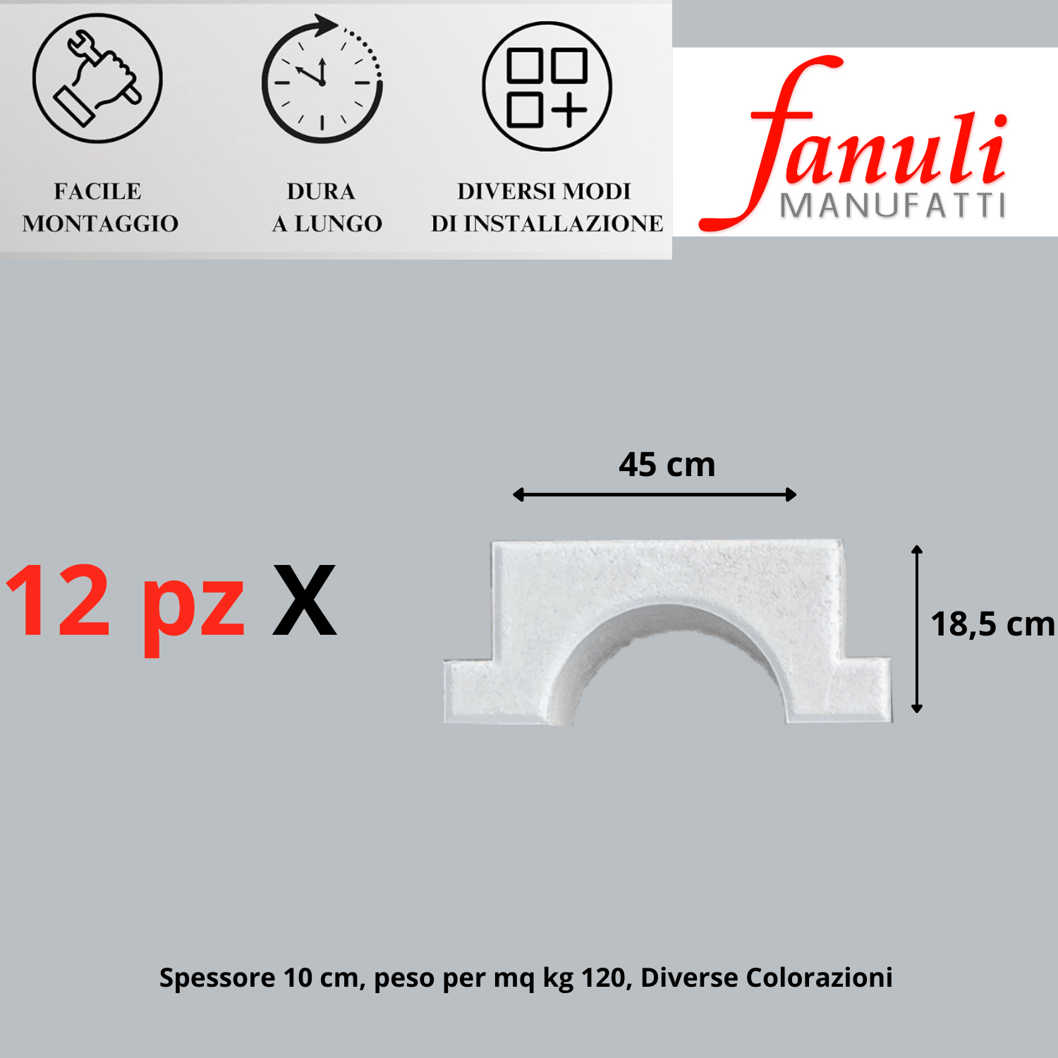 • CARATTERISTICHE TECNICHE: formata da 12 pezzi con elementi 45 x h18,5 spessore 10 cm;