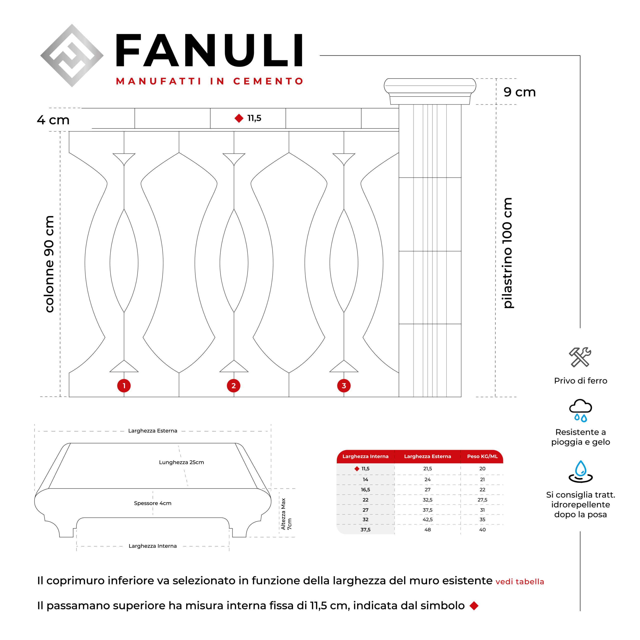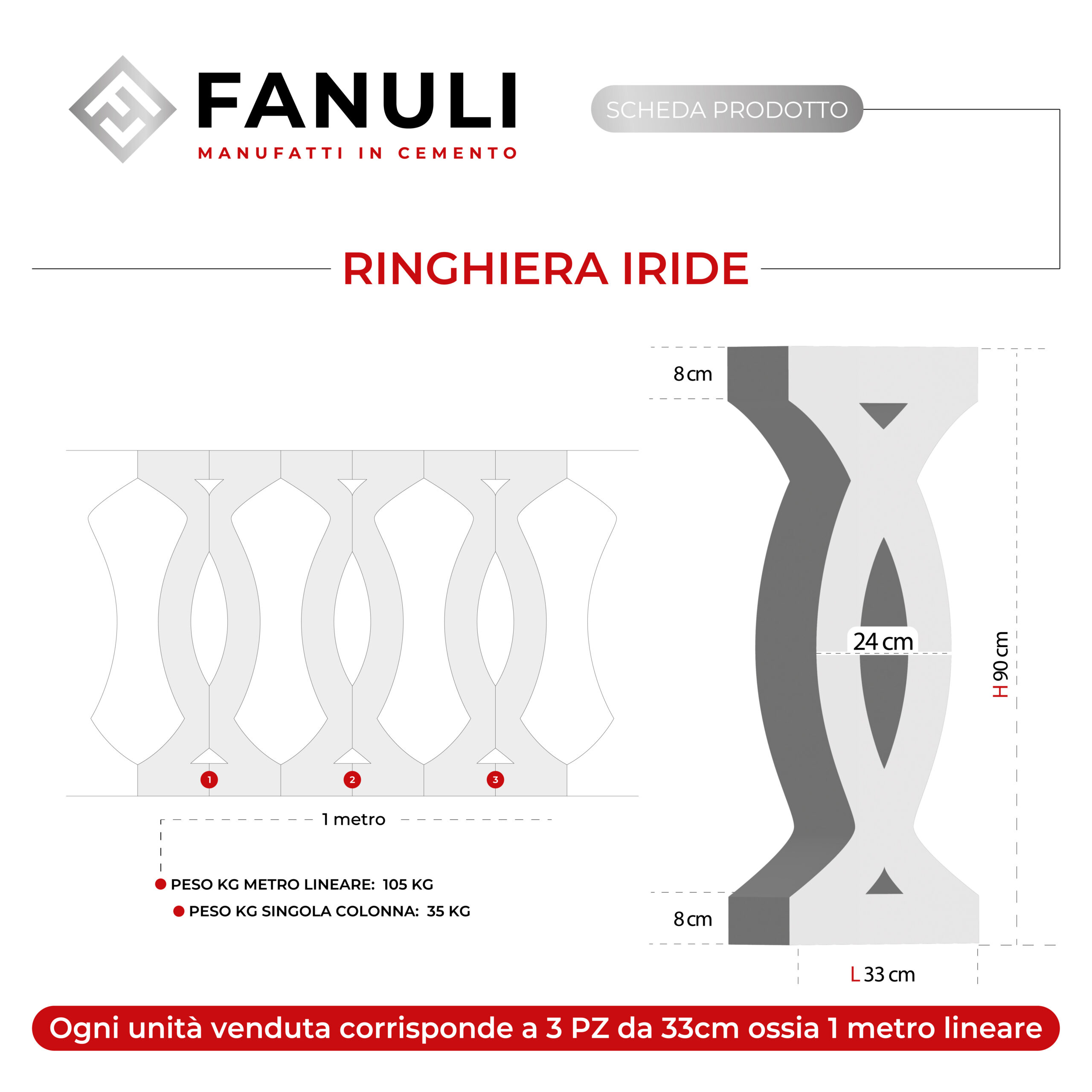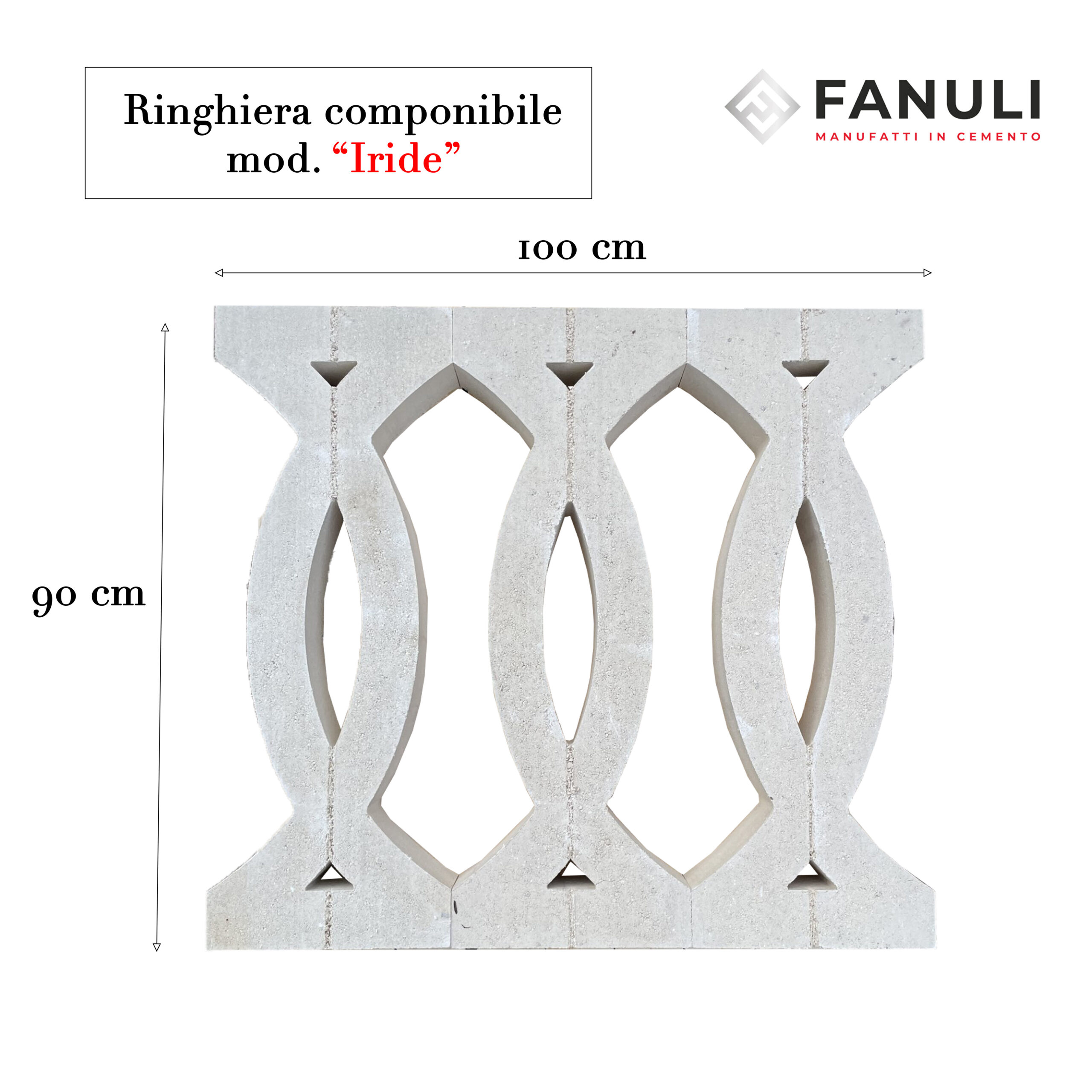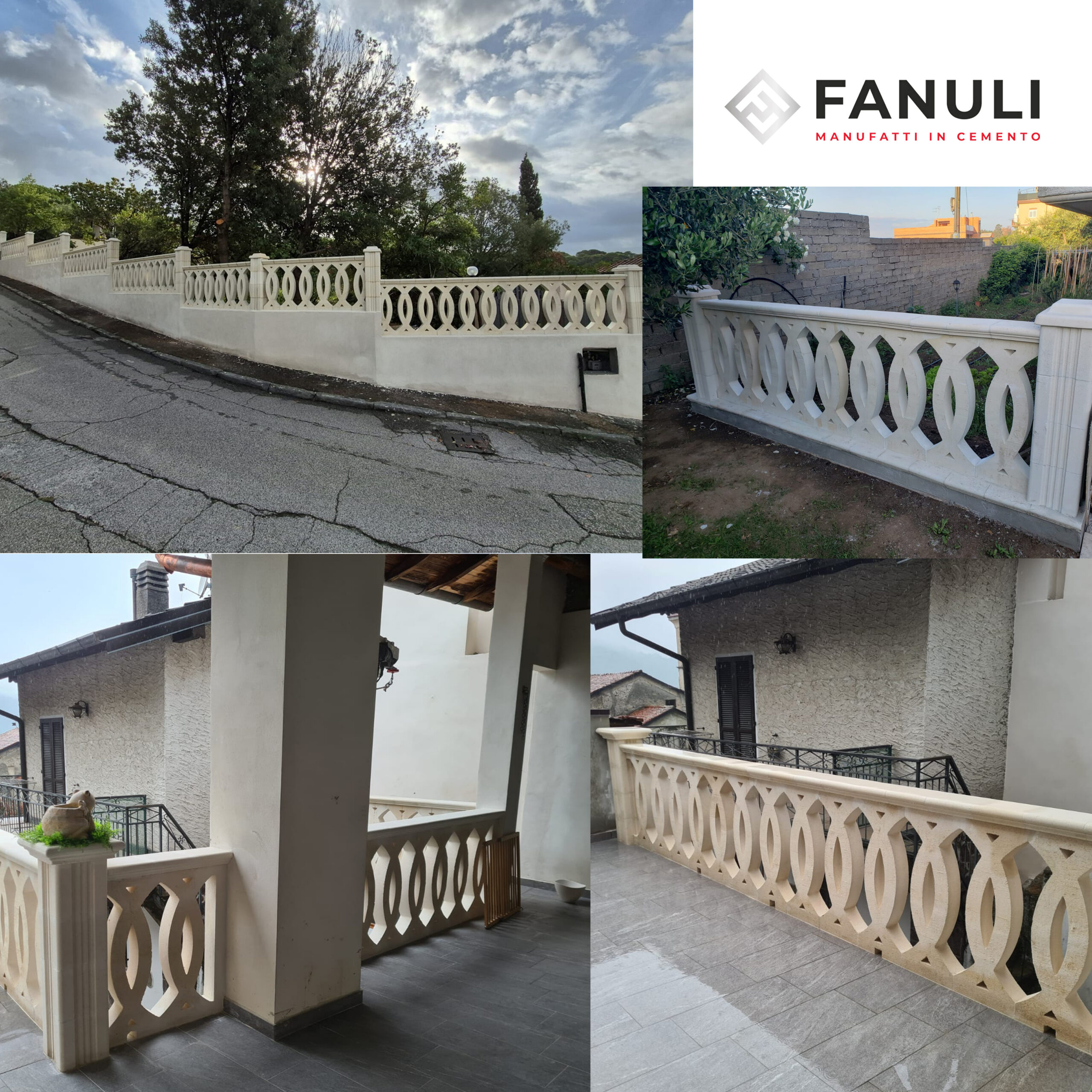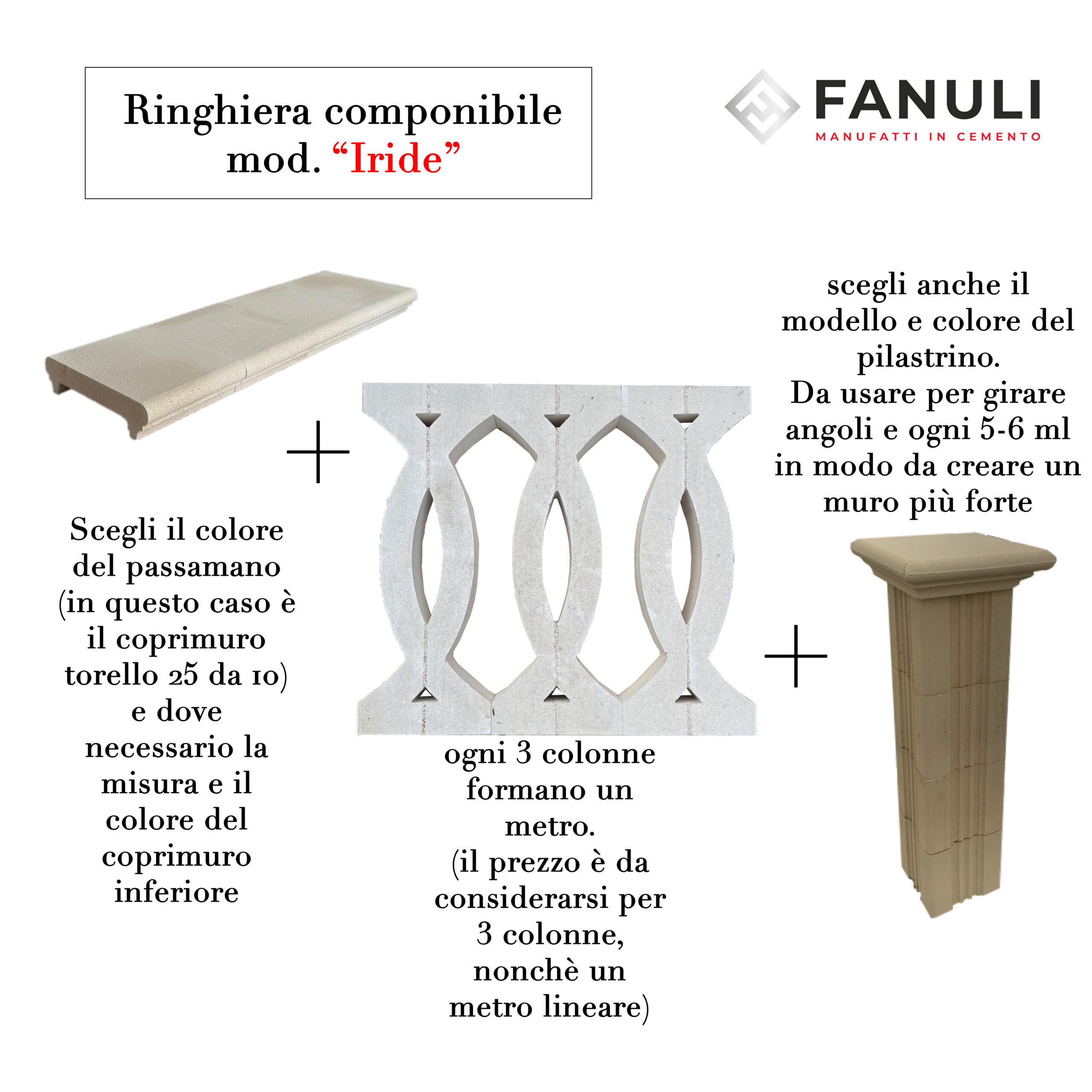Personalizzabile e facile da montare, la Ringhiera Iride, in cemento bianco, è perfetta da utilizzare anche come recinzioni per giardino o balaustra per esterni. Il prezzo si riferisce ad un metro lineare (3 colonne), escluso di passamano e/o coprimuro. Priva di armature in ferro, garantisce una maggiore stabilità in qualsiasi ambiente, evitando qualsiasi fenomeno di corrosione dovuto all’umidità con il trascorrere del tempo. Fanuli Manufatti, per spedire i propri prodotti utilizza corrieri idonei al trasporto, sicuri e provvisti di sponda idraulica. L’azienda nasce nel 1993 a Cutrofiano in provincia di Lecce, si occupa della produzione di manufatti in cemento e in graniglia di marmo. Passione, serietà, professionalità, ed esperienza acquisita nel tempo, garantiscono prodotti e servizi di prima qualità.