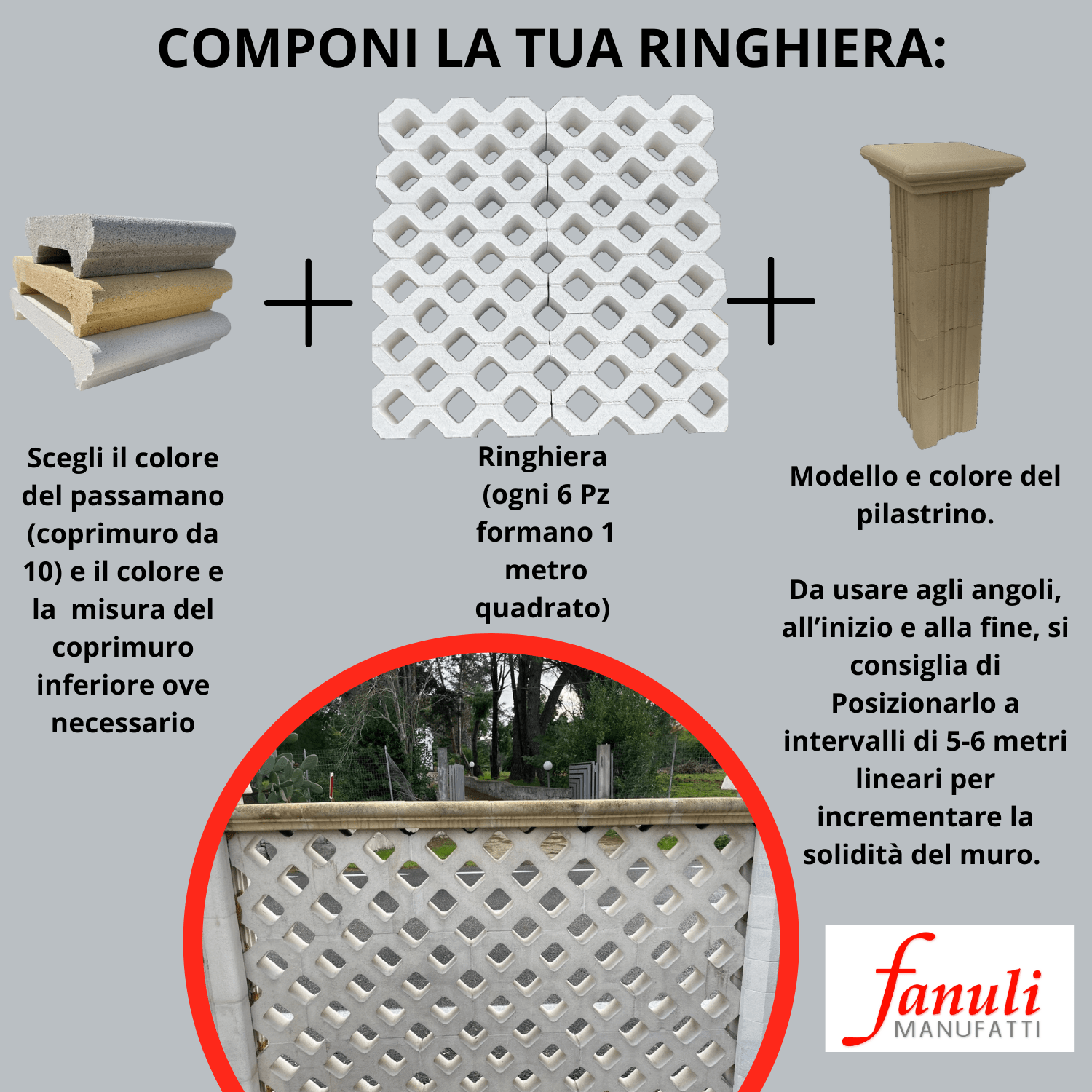 Contattaci se non riuscite a formulare il preventivo comprensivo di Pilastrini, passamano (il passamano è il coprimuro torello 25 misura interna 11,5) e Coprimuro inferiore ove necessario dipende dal muro che avete.