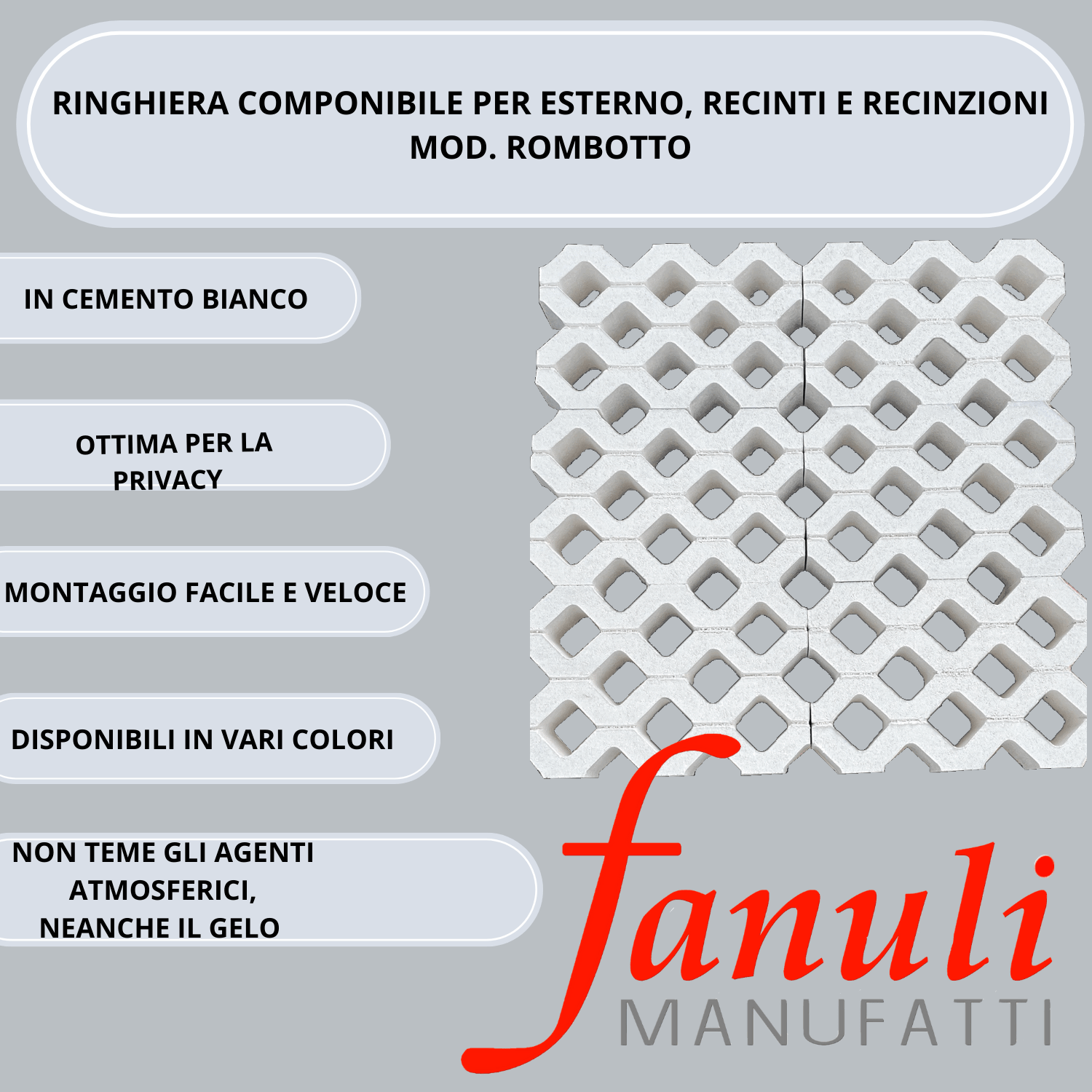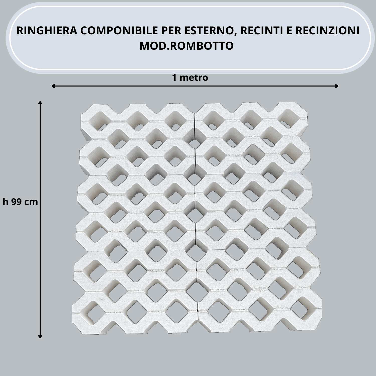 MATERIALE: Ringhiera Rombotto in cemento bianco per esterni. Ideale per recinzioni, ringhiere e balaustre, per effetto privacy col vicinato o come frangisole . Su richiesta, è possibile avere altre colorazioni;