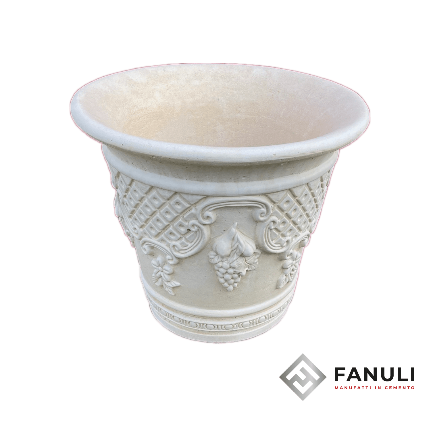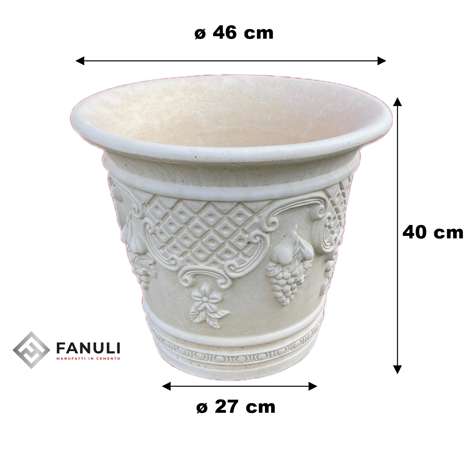 Vaso “Autunno con uva” h 40 x ø 46 cm in Cemento Bianco e Polvere di Marmo.