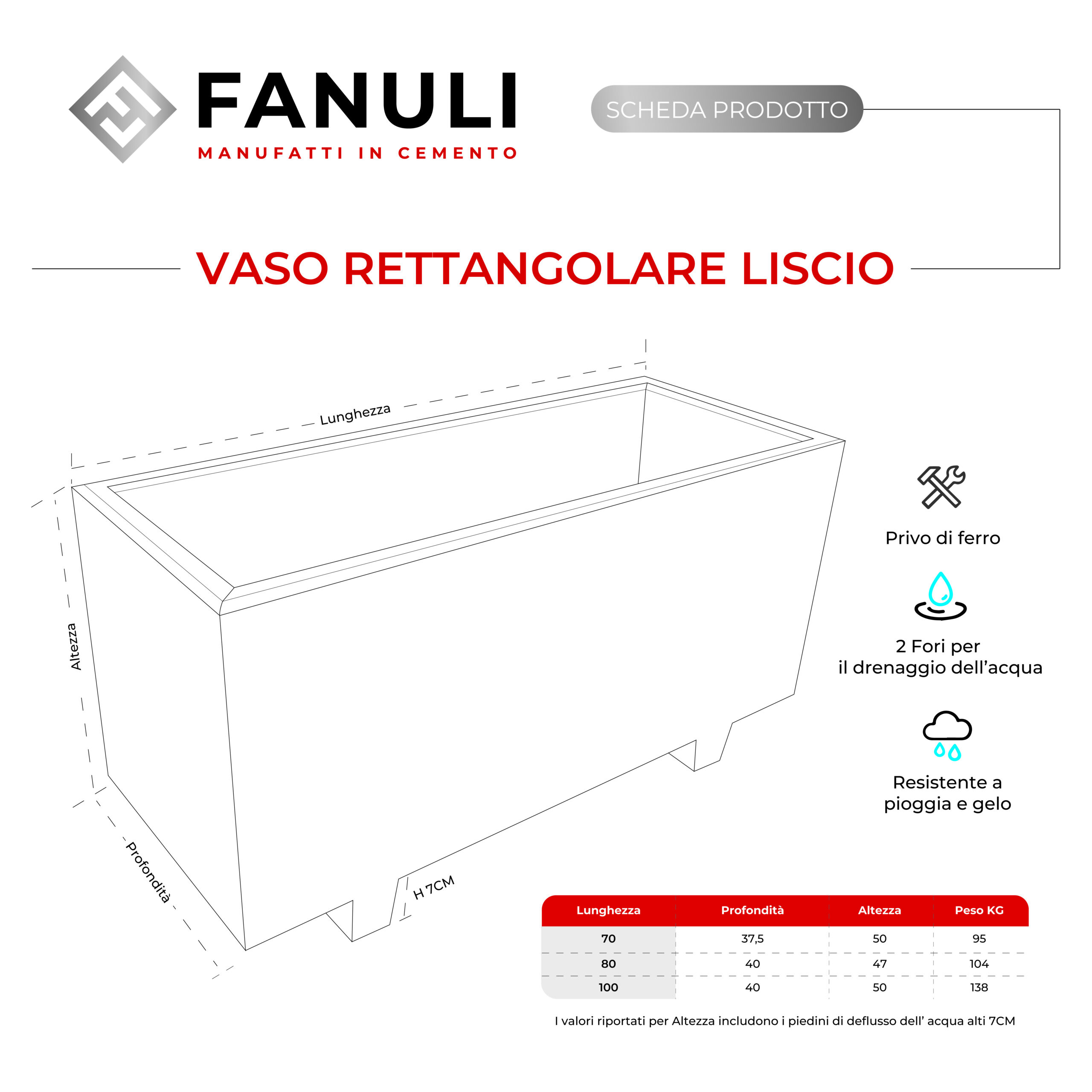 Vaso Rettangolare liscio 70 x 37,5 x h 50 in Cemento Bianco, kg 95