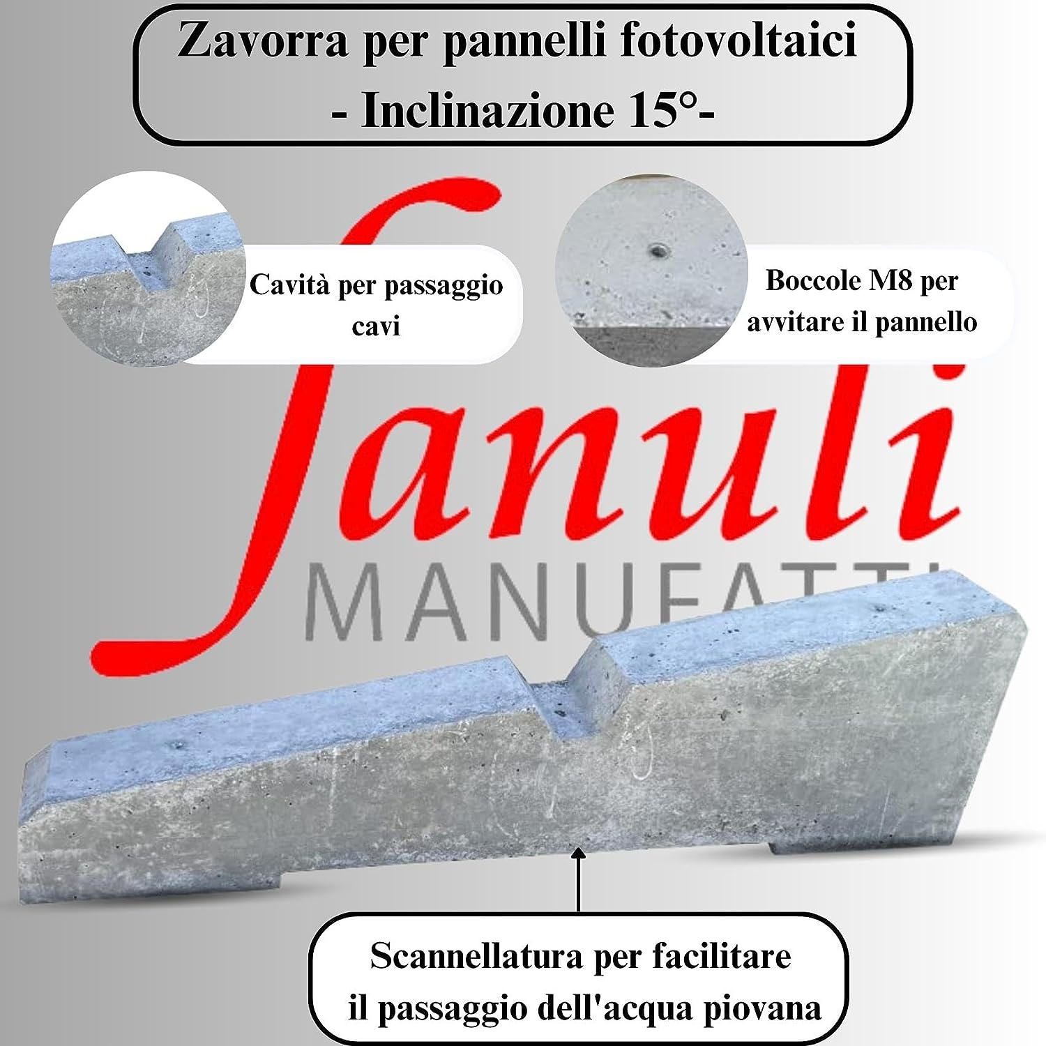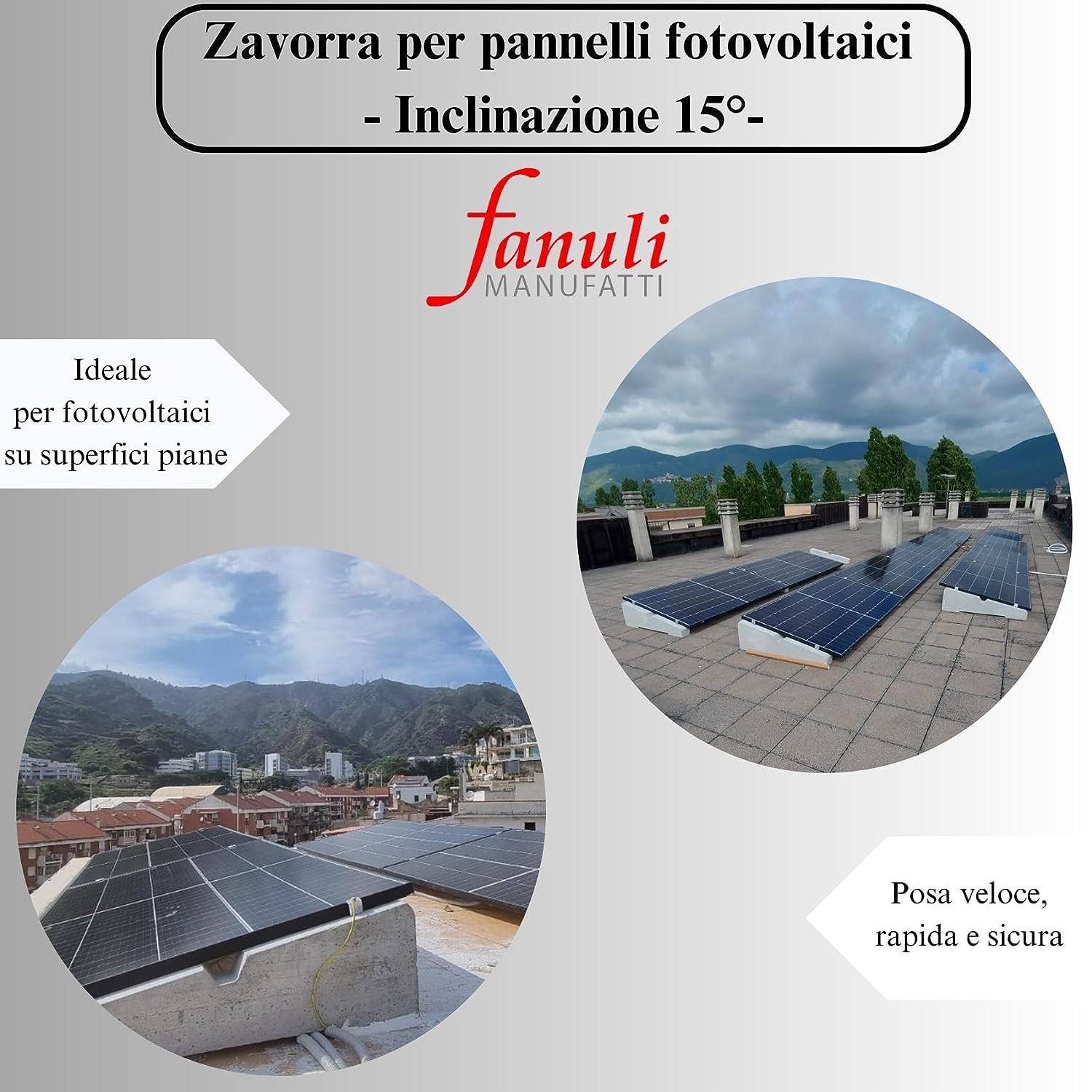 Le zavorre per fotovoltaici Fanuli, sono dei blocchi in calcestruzzo che servono per l’installazione veloce, pratica e sicura dei Pannelli fotovoltaici o solari, non hanno bisogno di ulteriori barre in alluminio in quanto hanno già predisposte dei fori con delle boccole zincate filettate da 8 mm per avvitare direttamente il pannello alla base del modulo, queste zavorre sono indicate per la realizzazione di impianti fotovoltaici a “terra”, sul terrazzo o su tetti piani. I nostri contrappesi sono dotati di una scanalatura alla base per facilitare il passaggio dell’acqua, Inoltre questi manufatti non presentano strutture metalliche all’interno in modo che non si deteriorano nel tempo. Fanuli Manufatti, per spedire i propri prodotti utilizza corrieri idonei al trasporto, sicuri e provvisti di sponda idraulica. L’azienda nasce nel 1993 a Cutrofiano in provincia di Lecce, si occupa della produzione di manufatti in cemento e in graniglia di marmo. Passione, serietà, professionalità, ed esperienza acquisita nel tempo, garantiscono prodotti e servizi di prima qualità.